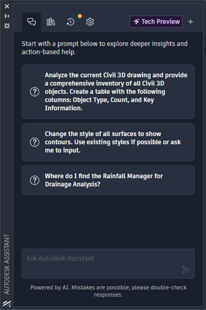 Assistant nově umí pomáhat s kontrolou standardů aktuálního výkresu podle souboru standardů, umožňuje výběr objektů na základě textového pokynu a dokáže odpovídat na otázky k výkresu, například ohledně hladin, bloků nebo dalších informací o datech ve výkresu. Rozšířeny byly také možnosti dotazování a úpravy vizuálních stylů objektů Civilu a analýzy rozsahů sklonu povrchu. Součástí je i knihovna promptů a historie chatu, takže práce s asistentem je praktičtější a přehlednější.
