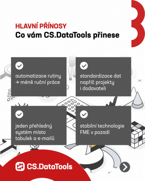 CS.DataTools je moderní webová aplikace určená pro práci s geografickými, projektovými a technickými daty. Jejím úkolem je zjednodušit složité procesy, automatizovat rutinní úkoly a zajistit, že data, se kterými pracují projektanti, koordinátoři či správci, budou vždy kvalitní, jednotná a okamžitě připravená k použití. Zároveň odbourává časově náročné úkony a úkony vedoucí k chybám.